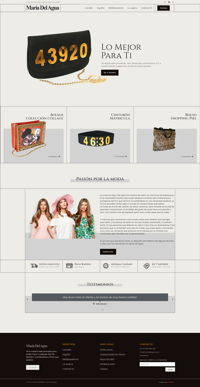 Transformamos la visión de María del Agua en una tienda online única y elegante, capturando la esencia distintiva de su moda en tan solo dos semanas. Nuestra agencia destaca por fusionar funcionalidad y estética, priorizando la elegancia del diseño y una experiencia de usuario intuitiva. La plataforma refleja la visión de la marca, abrazando el minimalismo con una paleta de colores sutil y una disposición limpia. Este proyecto demuestra nuestro compromiso con la excelencia, ofreciendo soluciones web que superan expectativas en el competitivo mundo del desarrollo online.